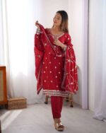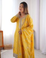 Women’s Silk Heavy Embroidery Sequence Work Top-Bottom Straight Kurti With Pant and Dupatta set