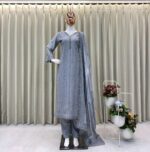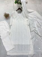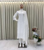 Women’s Chinon Silk with Cotton Thread Embroidery Straight Kurti With Pant and Dupatta set