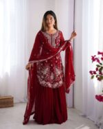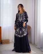 Women’s Faux Georgette Sequins & Thread Work Straight Kurta With Sharara Suit and Dupatta Set